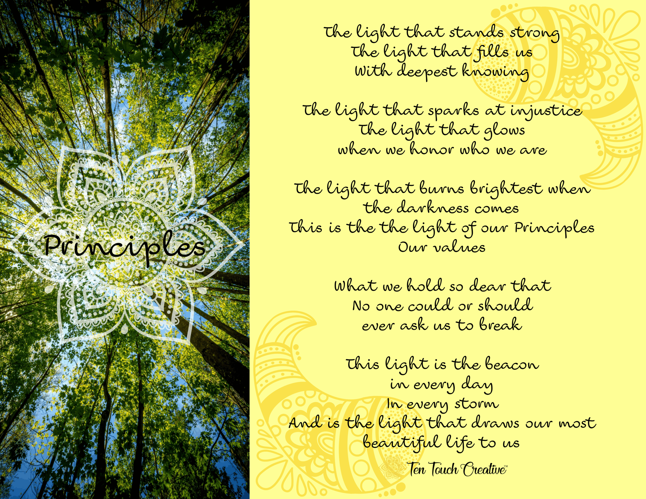 Principles is a special word, as it is the lighthouse that stands tall every day and shows the way. Principles are our values – what we hold most dear in our hearts.